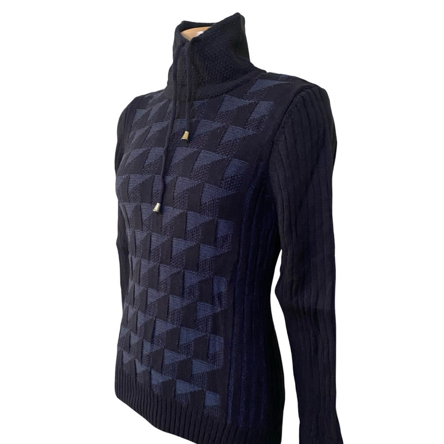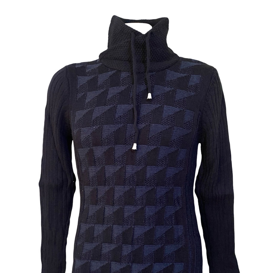 Elevate your cold-weather look with this sleek Navy Geo-Knit Drawstring Sweater. Featuring a sophisticated, tonal geometric pattern on the chest, a cozy ribbed funnel neck with an adjustable tie, and a comfortable, figure-flattering fit.